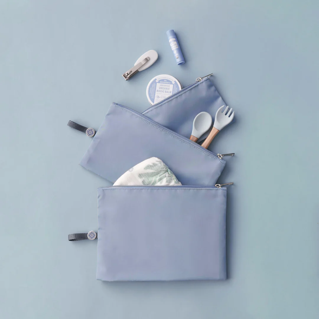 Up your diaper bag game with this set of 3 blue packing pouches, designed to fit perfectly in any HAPP diaper bag and keep it neat and organized. Just what makes our pouches so special? They feature a gusset-style bottom, which expands to provide the capacity you need for baby essentials or folds flat when empty! Medium and large sizes feature pull-tab loops that make it a cinch to grab and go. Organize your diaper bag even further (yes, it’s possible!) with this thoughtful pouch set that will change your packing game forever.